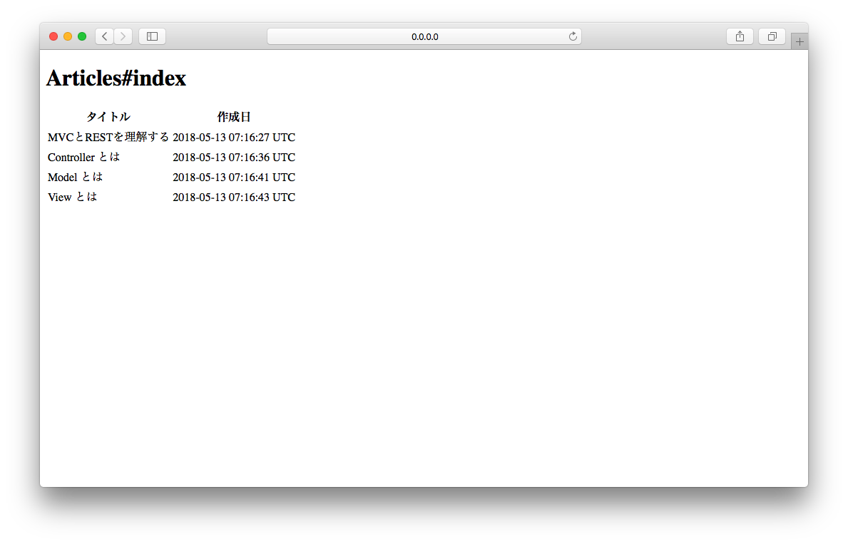 ブラウザから http://0.0.0.0:3000/articles にアクセスした結果は次のようになります。