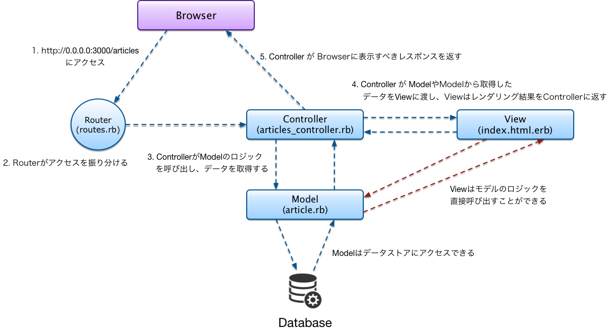 RailsのMVCは、Viewから直接モデルのビジネスロジックやデータストアにアクセスすることが可能です。 この点が一般的なMVCアーキテクチャとは異なります。 このアーキテクチャをMVCと呼んでもよいかは議論の余地がありますが、RailsのMVCはこういうものだと理解してください。